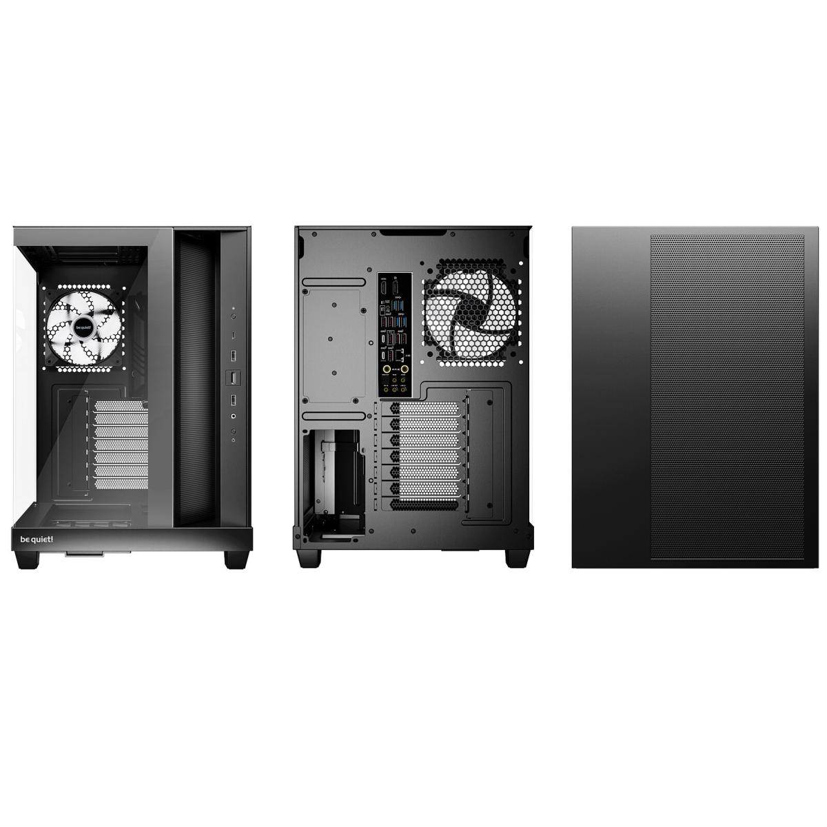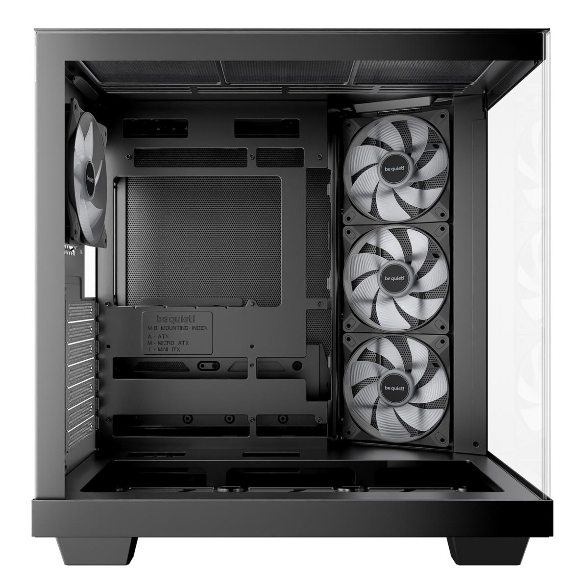 be quiet! a conçu le Light Base 500 LX pour être pleinement compatible avec les tendances modernes de connectique : le plateau de la carte mère prend en charge les designs avec connecteurs arrière (comme ASUS BTF, MSI Project Zero ou Gigabyte Project Stealth), permettant une intégration sans câble visible. Pour ce faire, l’alimentation et le support de stockage peuvent inverser leurs positions, maximisant ainsi la flexibilité d’installation sans sacrifier les emplacements disponibles.